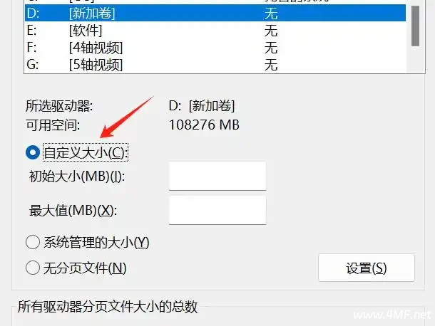 - 取消勾选 “自动管理所有驱动器的分页文件大小”。
