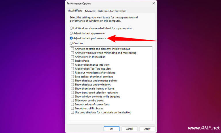 动画、阴影和透明度等视觉效果可以改善计算机界面的图形外观。然而,这些影响也会占用系统资源,而这些资源本可以更好地被其他东西使用。为了减少资源使用,我过去常常禁用这些视觉增强功能中的大部分。你也可以做同样的事情来减轻电脑的负担。