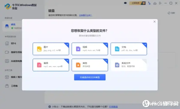 2.然后选择要扫描的数据类型,建议选择全部类型进行全盘扫描,点击 “扫描选中的文件类型” 开始扫描,