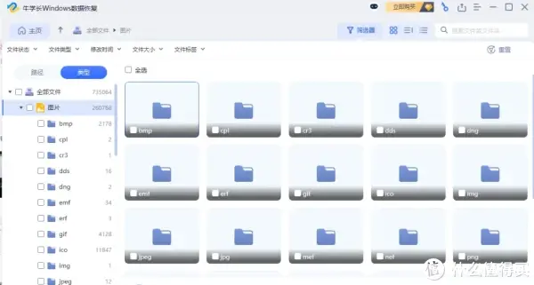 3.扫描完成后,软件将列出所选位置中的所有丢失文件,点击 “类型”,即可查看按照数据类别显示的所有数据;