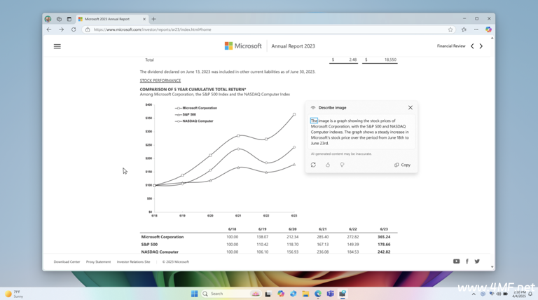 微软强化了图像描述功能(Narrator),现在 Copilot+ PC 支持读出各种图片的描述,帮助障碍人群了解图片中到底有什么东西。例如对于一张展示股票表现的图表,用户将得到如下详细描述“图表展示了微软公司的股票价格,同时包含 S&P 500 及 NASDAQ 电脑指数,该图表显示从 6 月 18 日至 6 月 23 日间微软股票价格的稳步上升”。