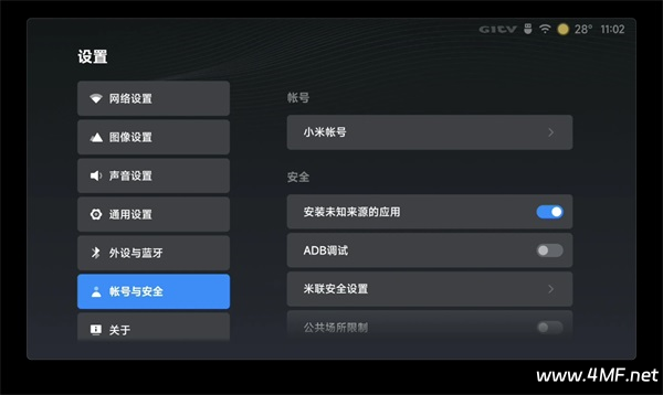 一、在小米/红米电视中打开“电视设置” ,选择 “账号与安全”,选择允许安装未知来源的应用。