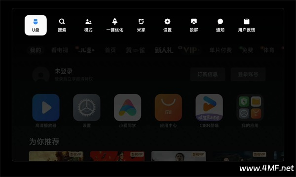 如果未弹出,可在电视首页最顶部,按“上”键,找到 U 盘。