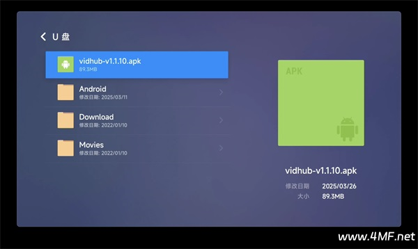 首先在本站下载最新的 vidhub TV 安装包,将安装包复制到 U 盘中,然后将 U 盘插入电视点击安装即可。