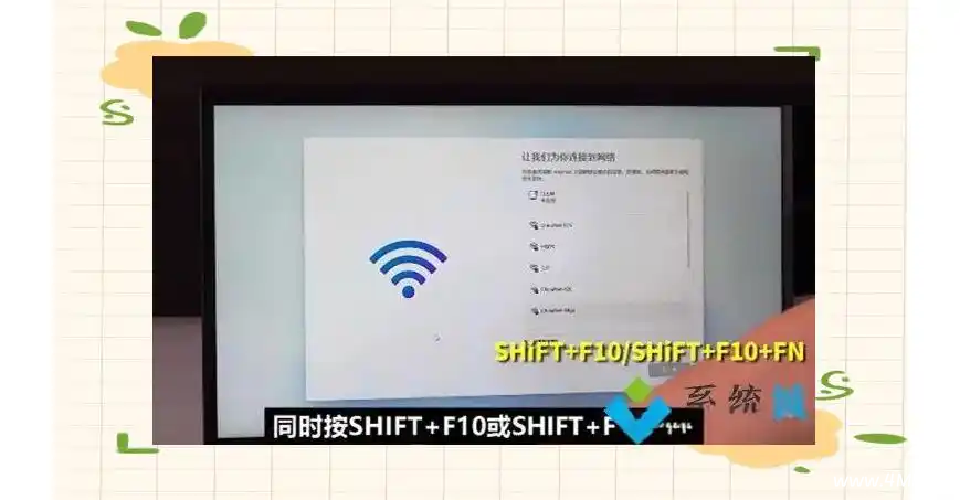 - 在联网界面,按 Shift + F10(部分笔记本需 Fn + Shift + F10),调出命令提示符窗口。