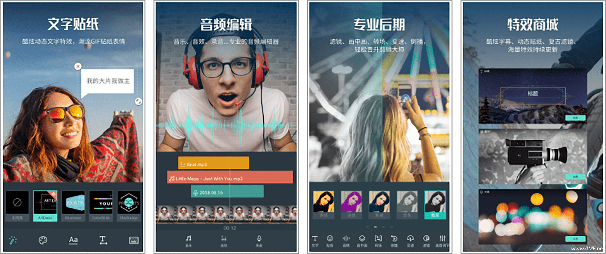 - PIP(画中画):添加多层视频、图像、贴纸、特效、文字等。