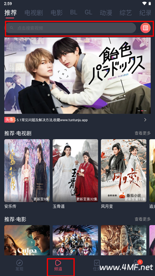 1、在“频道”页面的搜索框中,搜索自己想看的剧或者电影、综艺